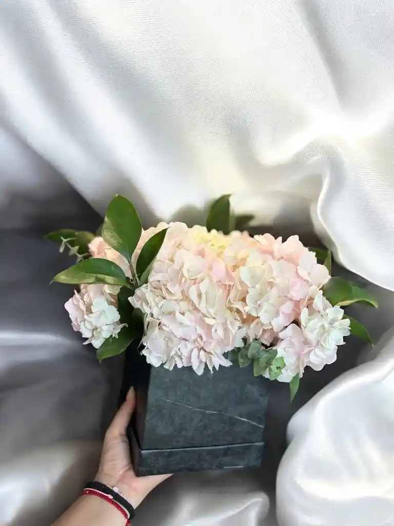 Caja cuadrada de hortensias con rusco y eucalipto. Nota: La flor puede ser sustituida dependiendo la disponibilidad de color y del producto “Mensaje Personalizado” máximo de 30 caracteres (Dejar el mensaje en el chat, los comentarios no se previsualizan para la tienda por lo que si se dejan allí no podrá ser incluido).
