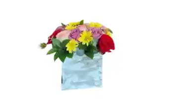 CAJA CUDARADA BLANCA CON 12 ROSAS CON COLORES ROJOS, ROSADO Y MORADOS, CON MARGARITA AMARILLA Y FOLLAJE DE RUSCO