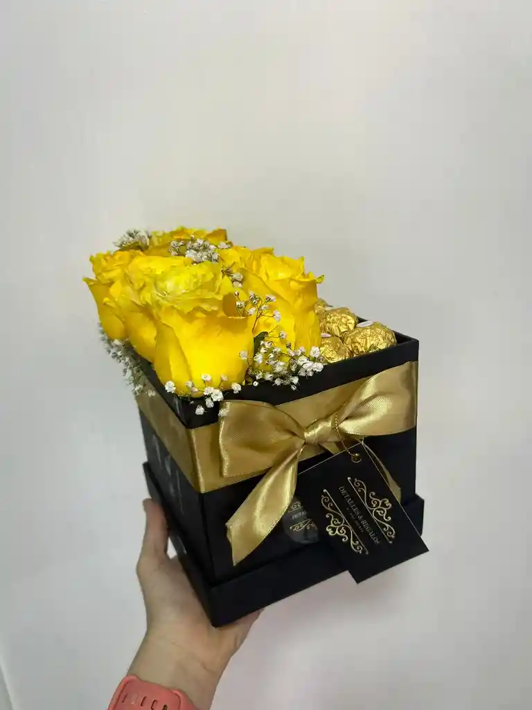 Una caja cuadrada de lujo de 15x15 cm, ideal para presentar un arreglo de rosas amarillas junto con bombones Ferrero. Este diseño combina la elegancia de las flores con la dulzura de los chocolates, creando un regalo perfecto para cualquier ocasión. Su presentación cuidada la convierte en una opción atractiva y sofisticada.