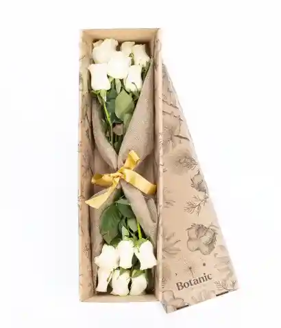 Caja Contiene 18 Rosas Blancas. Decorada con Follaje, Papel y Moño