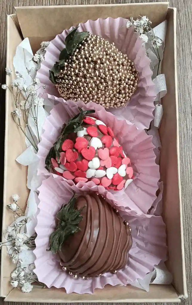 Deliciosas fresas tamaño yumbo cubiertas de chocolate blanco y/o de leche marca Luker, decoradas a elección y mensaje personalizado.
