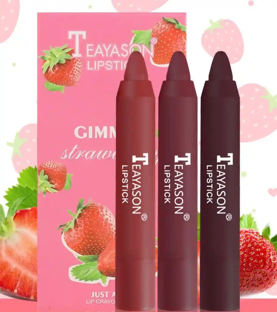 CAJA DE 3 LABIALES MATTE ATERCIOPELADO EN FORMA DE CRAYON FRESA