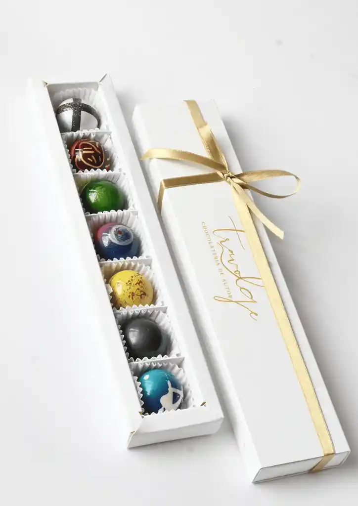 Descubre la exquisita caja de 8 bombones de chocolate de lujo, con hasta 8 sabores únicos y exclusivos. Cada bombón es una obra de arte de autor, elaborada con ingredientes de la más alta calidad, que promete deleitar tus sentidos. El empaque es elegante y sofisticado, ideal para regalar o disfrutar en ocasiones especiales, y viene acompañado de una tarjeta personalizada que añade un toque especial a tu elección.