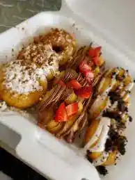 Caja de 9 9 mini donas/2 salsas/2 topping Topping Fresa en trozos Galleta Oreo M&M Maní Chips de chocolate Barquillo Piazza Chocolatina Jet Salsas Nutella Arequipe Leche Condensada