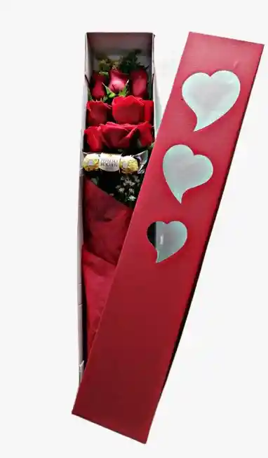 9 rosas rojas tipo exportación, caja blanca o roja (según disponibilidad) de 70cm x 13.5 x 8 cm y chocolate Ferrero x3 unidades. incluye decoración y tarjeta (indicar en el chat que mensaje desea)