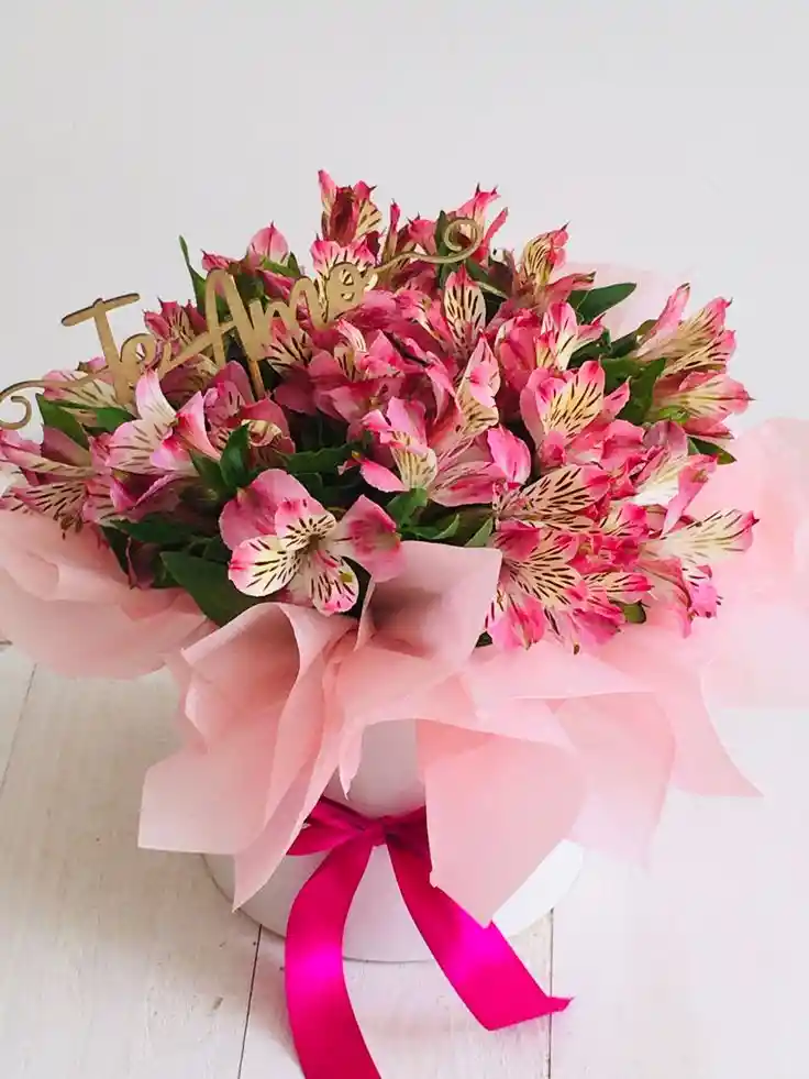 Caja de 2 paquetes de astromelia rosada Nota: La flor puede ser sustituida dependiendo la disponibilidad de color y del producto “Mensaje Personalizado” máximo de 30 caracteres (Dejar el mensaje en el chat, los comentarios no se previsualizan para la tienda por lo que si se dejan allí no podrá ser incluido).