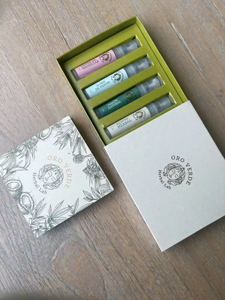 Nuestra caja de bienestar contiene cuatro (4) de nuestros aceites naturales en presentación bolsillo. 1. Gotas de bienestar (sandía) 3ml Esta mezcla de aceites y esencias herbales con extracto de cáñamo, tiene un alto uso terapéutico a nivel mundial, ya que el CBD puede brindar alivio para el dolor crónico, la ansiedad, la inflamación, la depresión, el insomnio y muchas otras afecciones. Además, ayuda a mantener un buen estado de ánimo de manera natural. Nuestro aceite tiene una concentración de 10% de CBD AISLADO mezclado con aceite de cáñamo y de coco para obtener mejores resultados. Esencia de piña o sandía. 2. Aceite corporal para masajes masculinos - Pasión natural. 3 ml Esta mezcla de aceites naturales de jojoba, coco y almendra, mezclado con aceite de cáñamo, deja la piel suave y aterciopelada. Proporciona sensaciones térmicas que estimulan las zonas erógenas propiciando excitación y placer. 3. Aceite corporal para masajes femeninos - Elixir de pasión. 3 ml Este aceite te ayudará a intensificar sensaciones a través de un masaje placentero, lo que te permitirá vivir mayor excitación y lubricación natural en la mujer. Sentirás sensaciones térmicas y un cosquilleo prolongado. Esto te permitirá vivir una experiencia única. Te recomendamos aplicarlo en el juego previo. 4. Linimento caliente - Alivio herbal. 3 ml Nuestro linimento herbal a base de extractos de plantas medicinales como caléndula, árnica, eucalipto y menta, está combinado con aceite de cáñamo, todos los ingredientes combinados proporcionan efectos relajantes y analgésicos que aporta alivio. Te recomendamos usarlo después de actividades físicas y en las noches antes de dormir, cuando tienes dolores musculares por varios días.