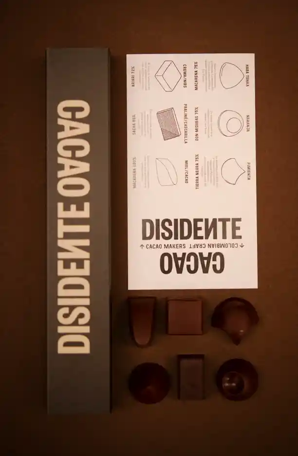 Caja de bombones con 6 variedades, Macarena 100% con relleno de miel más cacao, Macarena 75% relleno de chocolate blanco y habatonka, Tierre negra 75% relleno de chocolate blanco y pimienta, Don miqueas 75% relleno de chocolate blanco y naranja, Ariari 72% relleno de crema de marañon y nibs, Sacha 85% relleno de praline y cascarilla.
