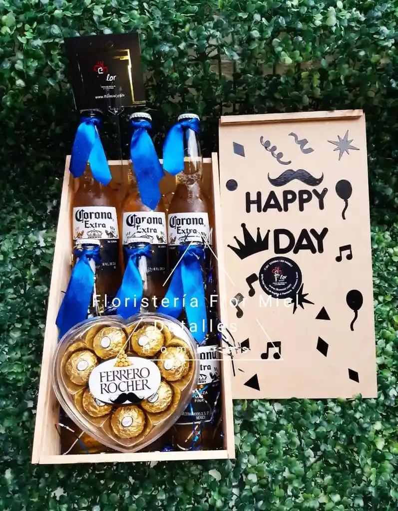 Caja de madera con tapa, 6 Cervezas Corona Y Chocolates Ferrero Rocher en forma de corazón