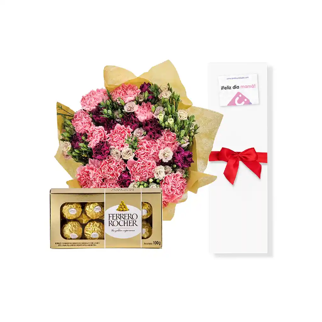 Caja de chocolates en forma de corazon en 8 unidades y ramo de claveles naturales de 37 unidades con caja de carton reciclable