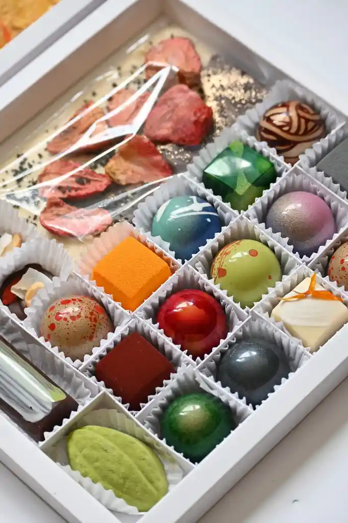 Nuestra caja de chocolates es un homenaje al cacao colombiano y la creatividad en cada relleno. Incluye: 🍫 15 bombones de autor, cada uno con un sabor único. 🍫 3 mendiants con marañón, bayas de goji y coco. 🍫 Un bombón en forma de cacao, cubierto con pintura de terciopelo y relleno de gianduja de maní. 🍫 Una barra de chocolate con caramelo melcochudo y gianduja de maní. 🍫 Una tableta infusionada con habatonka, disponible en dos versiones: ✨ Frutos amarillos, marañón y pétalos de caléndula. ✨ Fresas liofilizadas y sal de Hawái. El regalo perfecto para sorprender con un detalle exclusivo y lleno de sabor.