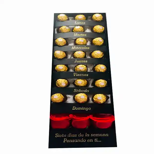 Caja de lujo de 21 chocolates y 3 rosas .