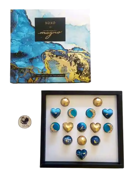 Gemas de chocolate decoradas con laminilla de oro de 24 K y pintadas a mano. Cada gema tiene un diseño único. Esta presentación es una representación artística del Mar. 3 und de chocolate blanco con ganache de Bailey's 3 und de chocolate de leche con relleno de Smore's (marshmallow con galleta y caramelo) 3 und de chocolate semioscuro (60% de cacao) con mantequilla de maní y crocante de galleta 4 und de chocolate blanco con Oreo 2 und de chocolate de leche con relleno de cheescake de frutos rojos Incluye tarjeta para poner un mensaje.