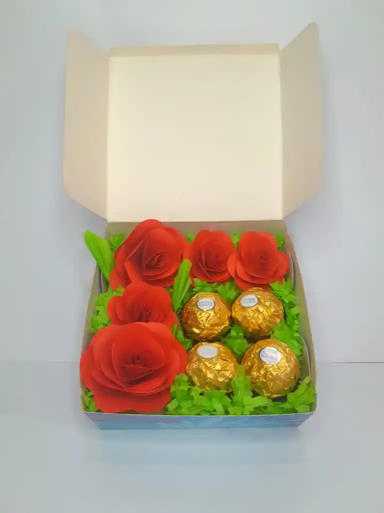 INCLUYE: 4 CHOCOLATES FERRERO ROCHER FLORES DECORATIVAS HECHAS 100% A MANO CAJA DECORATIVA DE TU ELECCIÓN TARJETA DE PARA