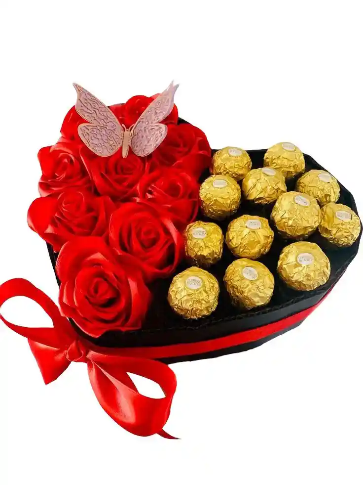 CAJA DE CORAZÓN CON ROSAS ETERNAS Y 12 CHOCALATES FERRERO