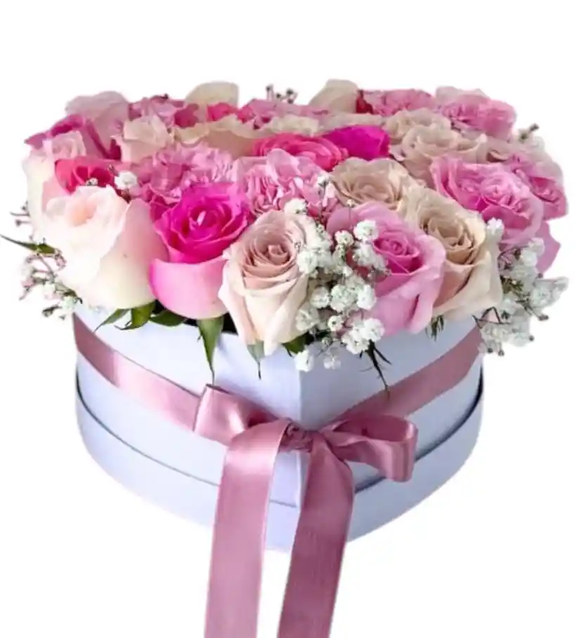 CAJA DE CORAZON CON 24 ROSAS DE COLOR ROSADO, MOÑO , TERJETA `PERSONALIZADA