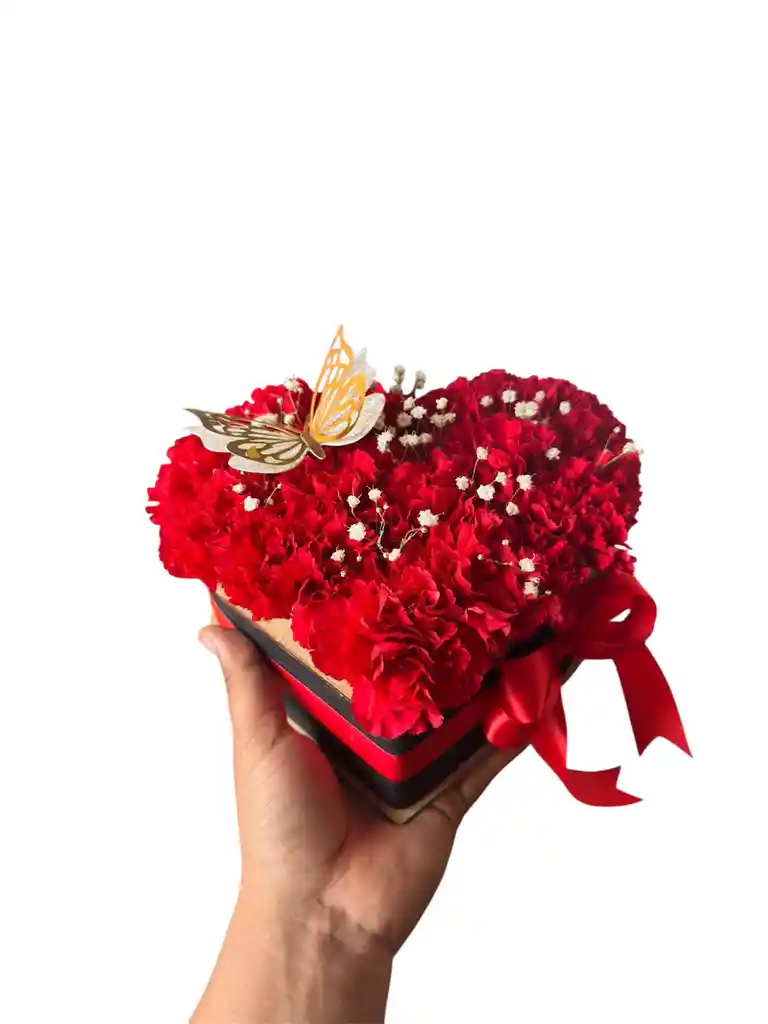 Hermosa caja de corazón con hermosos claveles de color rojo carmesí, ideal para ese momento romántico que deseas tener con esa persona, con una mariposa y follaje de gipso