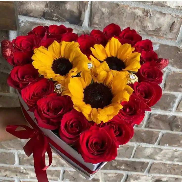 Caja de corazón con rosas, girasoles y chocolates Un hermoso diseño en forma de corazón que combina 6 a 8 girasoles, 12 rosas y deliciosos chocolates, ideal para sorprender con un detalle vibrante y dulce. Nota: La flor puede ser sustituida dependiendo de la disponibilidad de color y del producto. "Mensaje Personalizado" máximo de 30 caracteres (Dejar el mensaje en el chat, los comentarios no se previsualizan para la tienda, por lo que si se dejan allí no podrá ser incluido).