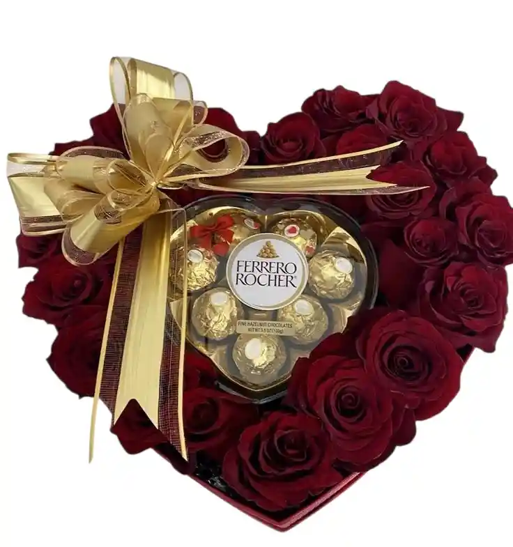 es la combinación perfecta de romance y deleite, diseñada para conquistar los sentidos desde el primer instante. El arreglo se presenta en una elegante caja artesanal en forma de corazón, bordeada por un marco de rosas rojas de calidad premium con pétalos de textura aterciopelada que simbolizan el amor profundo. En su centro, una exclusiva caja de bombones Ferrero Rocher