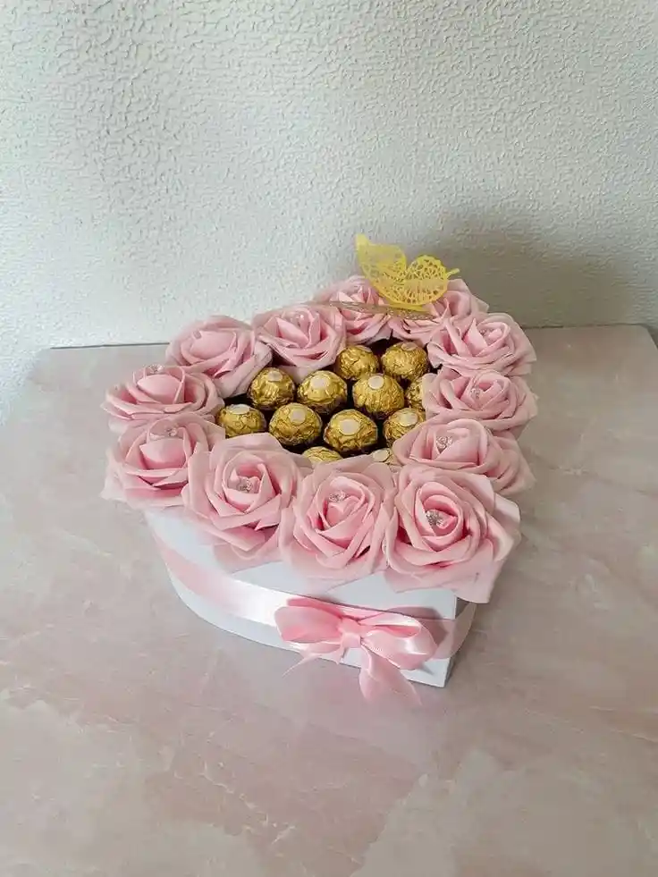 Incluye, rosas rosadas, chocolates ferreros, decoración en caja de corazón ( puede ser de madera o color blanca, dependiendo disponibilidad) y mensaje personalizado