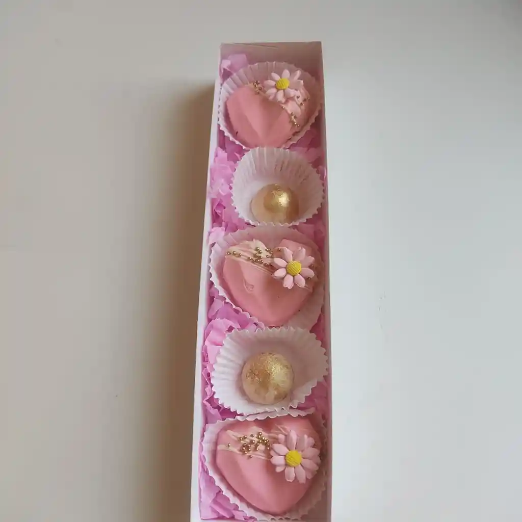 Caja con 3 corazones rellenos y dos bombones, incluye moño y tarjeta