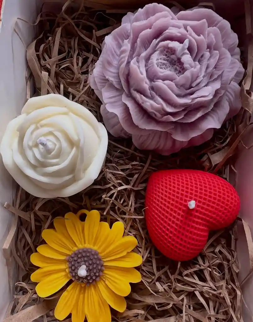 Set de Velas Decorativas y Aromatizadas: Peonía, Margarita, Corazón y Rosa. Su detallado acabado y variedad de colores las convierten en una opción ideal para la decoración, momentos especiales o como un obsequio único y elegante.