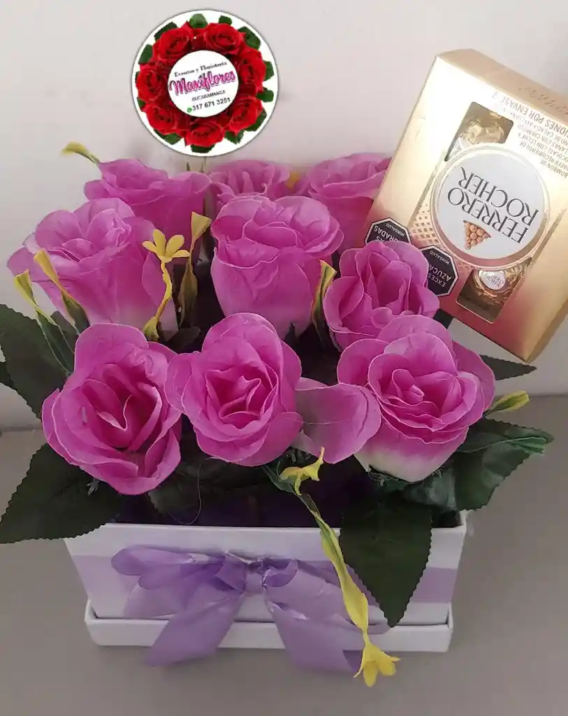 caja blanca de rosas preservadas rosadas mas follaje y chocolates