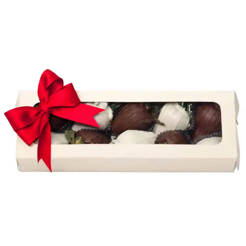 • 5 fresas con chocolate blanco • 5 fresas con chocolate negro • 1 caja