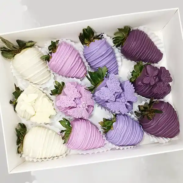 Caja por 12 fresas con chocolate. Tonos: blanco, lila y morado. Incluye tarjeta dedicatoria personalizada