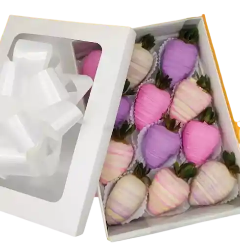 Deliciosa caja de fresas con chocolate Rosa ,lila, blanco por 12 unidades. Fresa premium seleccionada.