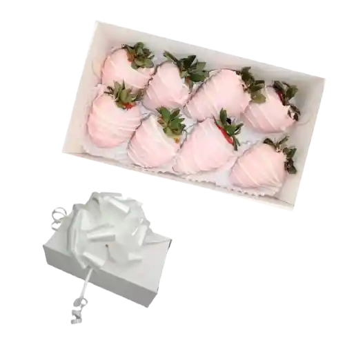 Deliciosa caja de fresas con chocolate Rosa con líneas blancas por 8 unidades. Fresa premium seleccionada.