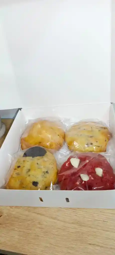 caja de galletas surtida con sabores: - red velvet con chocolate blanco - chips de chocolate - galleta oreo - dos chocolate