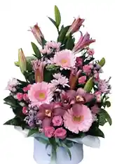 Un elegante arreglo floral en caja redonda con una hermosa combinación de flores rosadas, 3 gerberas , 12 rosas minis , 6 lirios , medio paquete de margarita y rusco perfecto para transmitir dulzura, ternura y cariño en cualquier ocasión. Nota: La flor puede ser sustituida dependiendo de la disponibilidad de color y del producto. "Mensaje Personalizado" máximo de 30 caracteres (Dejar el mensaje en el chat, los comentarios no se previsualizan para la tienda, por lo que si se dejan allí no podrá ser incluido).