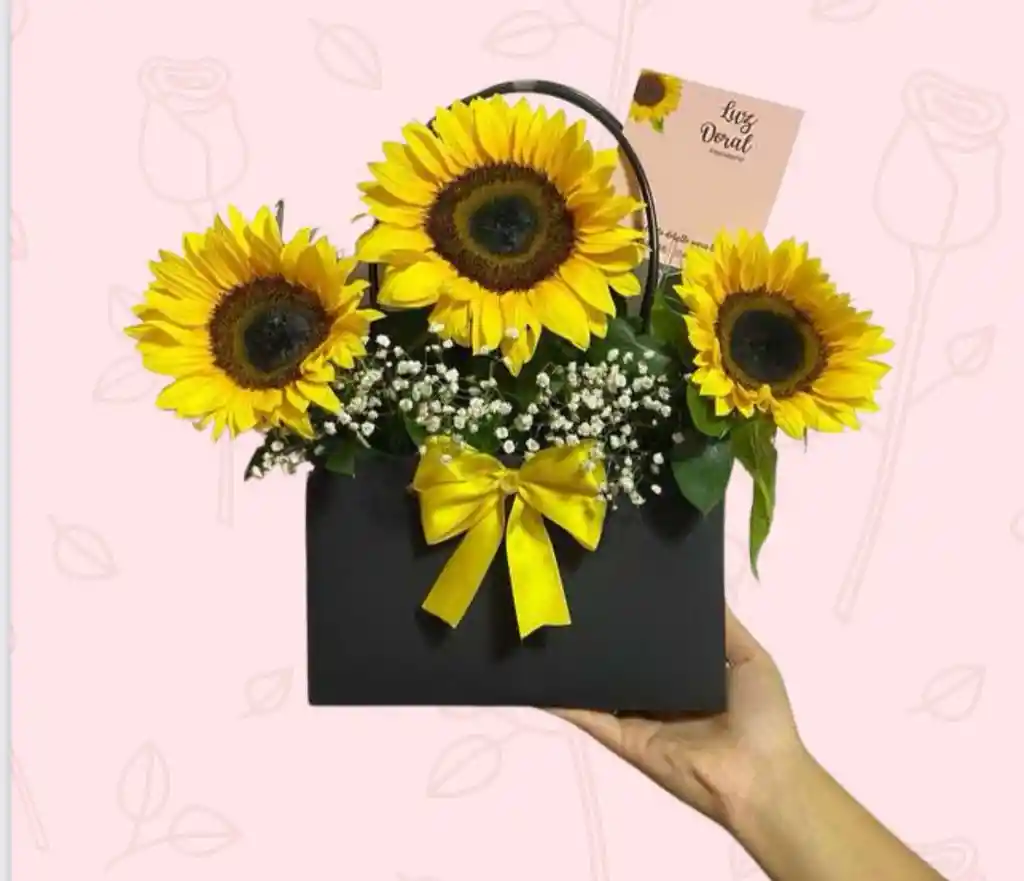 BOUQUET FLORAL QUE INCLUYE 3 GIRASOLES DECORADOS CON RELLENO FLORAL, MOÑO DECORATIVO. INCLUYE TARJETA PERSONALIZADA.