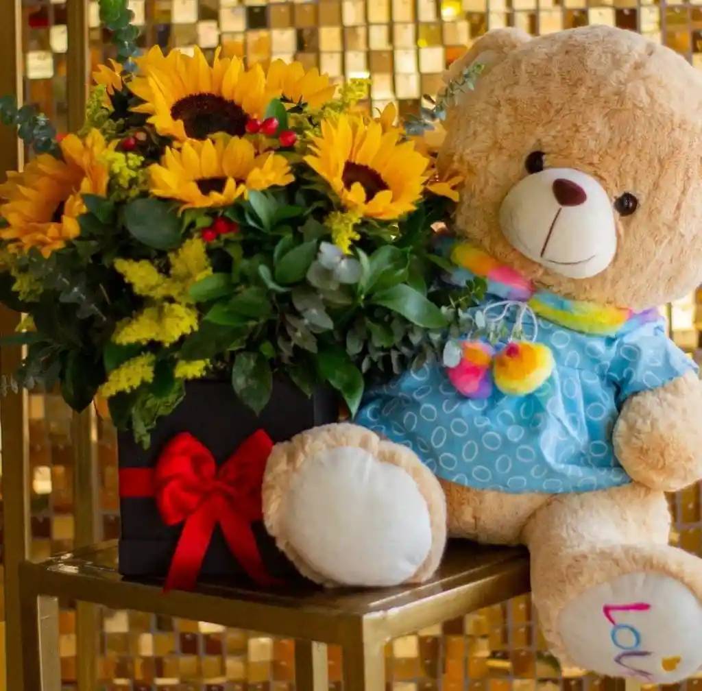 Caja de girasoles con peluche