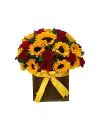 Caja de 15 girasoles y 20 rosas Nota: La flor puede ser sustituida dependiendo la disponibilidad de color y del producto “Mensaje Personalizado” máximo de 30 caracteres (Dejar el mensaje en el chat, los comentarios no se previsualizan para la tienda por lo que si se dejan allí no podrá ser incluido).