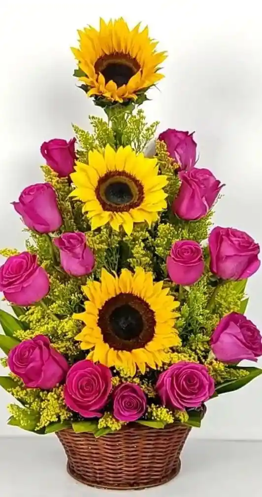 Incluye: caja de madera (puede variar según disponibilidad) girasoles X3, rosas fucsias x13, solidario y decoración más mensaje personalizado