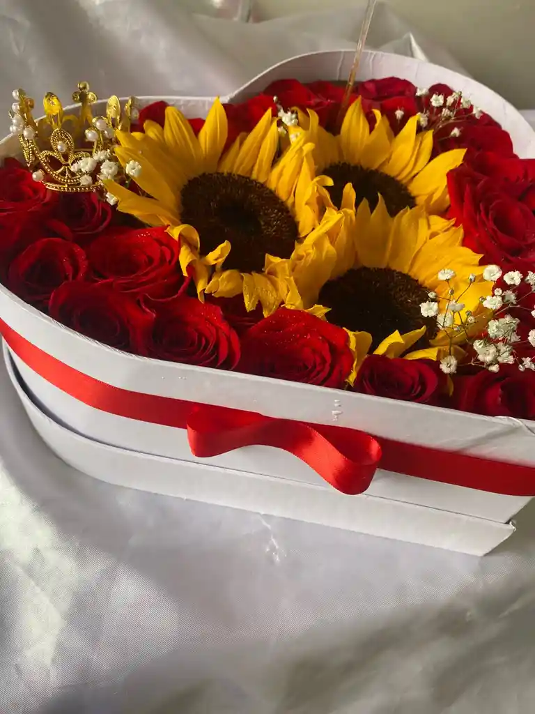 Hermosa Caja en forma de corazón estilo de lujo con 24 rosas rojas 3 girasoles y jipsu blanco, un detalle hermoso con entrega inmediata en Bogotá incluye tarjeta personalizada ideal para cumpleaños o cualquier día especial