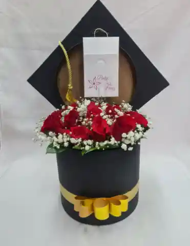Esta caja es especial para grados, representa el birrete de grado, elaborado en rosas con medidas aproximadas de 25*25*25 cm