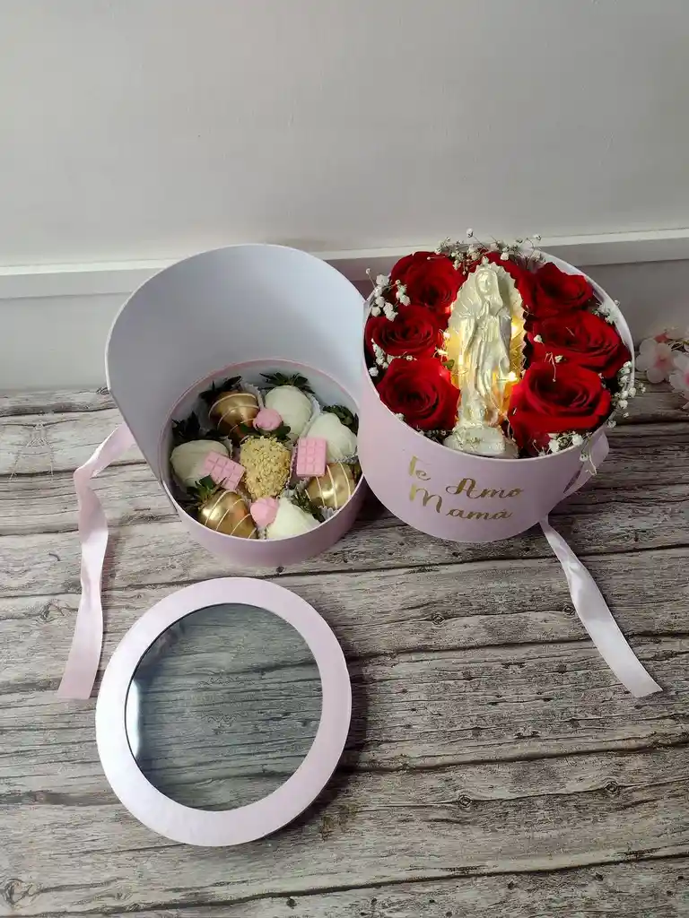 Cilindro mediano apertura de dos pisos con rosas, virgen pequeña y fresas con chocolate Especial Día de las Madres. Color de caja a escoger entre: rojo, blanco, dorado, negro, según disponibilidad. Informar preferencia en el chat. Color de rosa a escoger entre: Rojo, rosado, blanco, amarillo, lila, según disponibilidad. Informar preferencia en el chat.