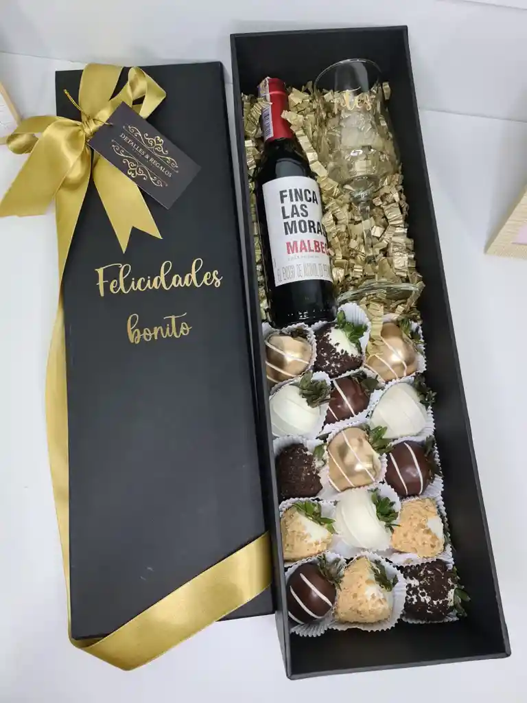Caja de lujo 50x15x10 Escoger color de caja (Negra, Blanca, dorada, Roja) Mensaje en tapa máximo 5 palabras Copa 15 fresas con chocolate; Surtidas Vino 375ml
