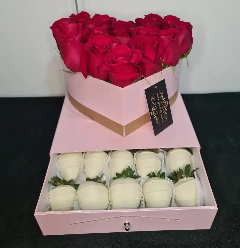 AGENDAR CON MÍNIMO 3 HORAS DE ANTICIPACIÓN. Caja de lujo corazón con rosas y fresas con chocolate y tapa de acetato. Color de rosa a disponibilidad.