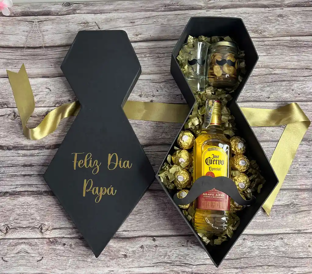 Caja de lujo Corbata con Botella Jose cuervo especial 375 ml, copa contramarcada, frasco de frutos secos y ferreros ESPECIAL DE PADRES, DIA DEL PADRES. HOMBRE