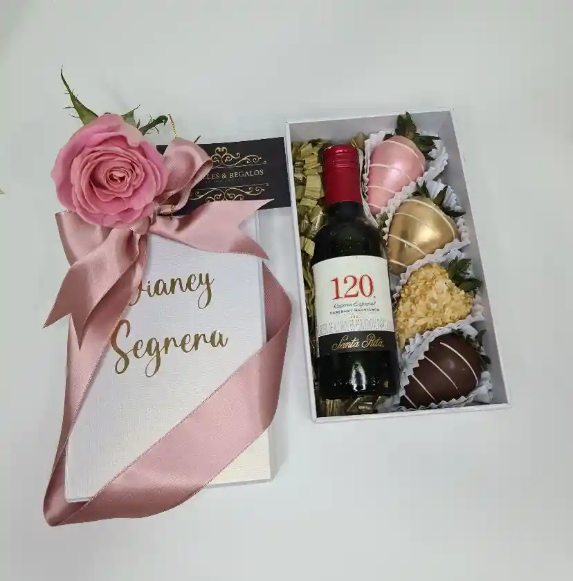 Caja de lujo pequeña con vino mini de reserva con 3 a 4 fresas con chocolate 🍫. Caja marcada max 3 palabras (informar por chat de rappi, de lo contrario se colocará Feliz Día)