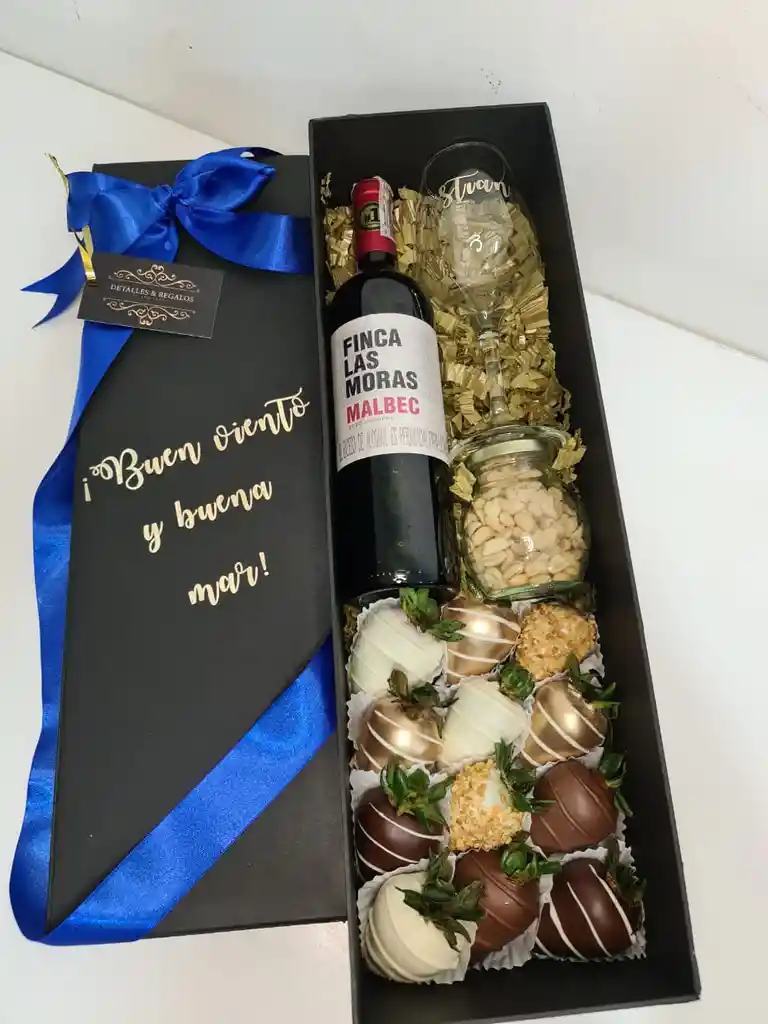 Caja de lujo de 50x15x10 Vino finca de las moras 750ml Copa vino Frasco maní Fresas con chocolate surtidas (informar en chat si la persona come maní) Colores de la caja a disponibilidad: Negra, dorada, roja, Blanca. (informar en chat rappi color) Mensaje en tapa personalizado de máximo 5 palabras. (informar en chat de rappi, de lo contrario se colocará Feliz Día) si desea la copa con el nombre de la persona informar.