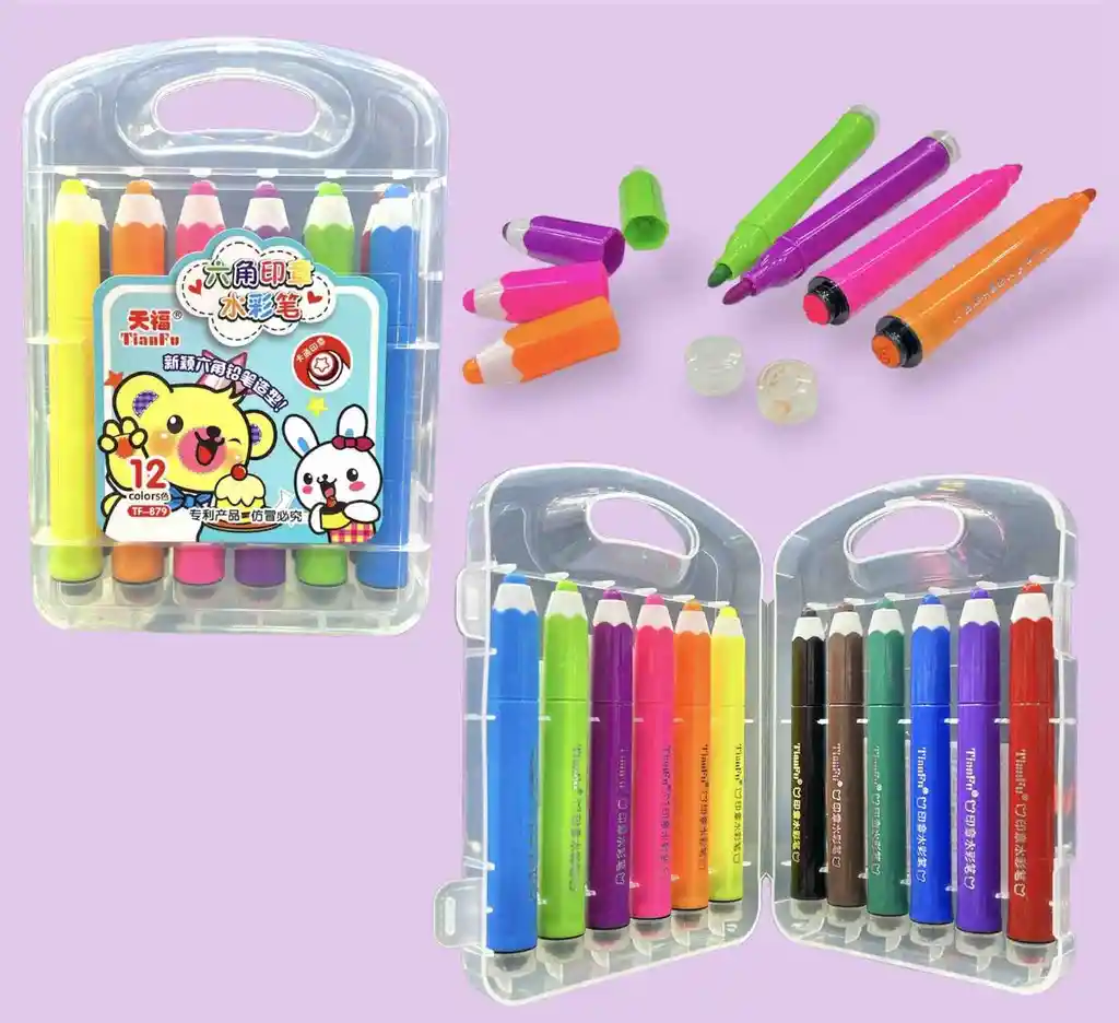 SET DE 12 MARCADORES CON SELLO EN FORMA DE LAPIZ DE COLOR.