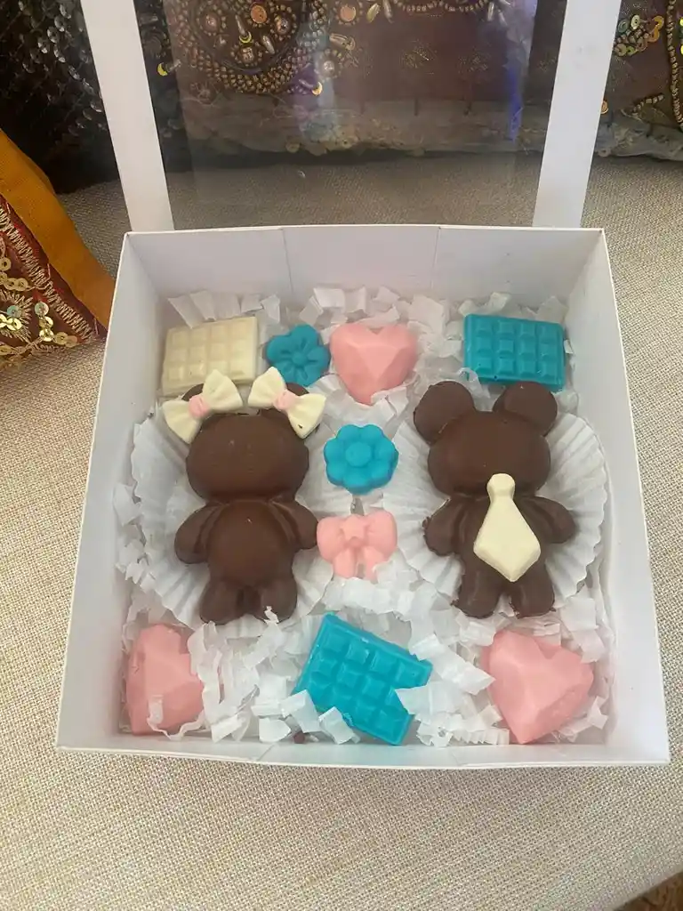 Caja de pareja de osito en chocolate inluye moño y tarjeta