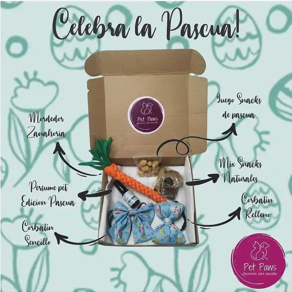 Incluye: Mordedor Zanahoria Perfume Pet Edición Pascua Mix Snacks Naturales Corbatín sencillo Corbatín relleno Snacks minijuego Pascua