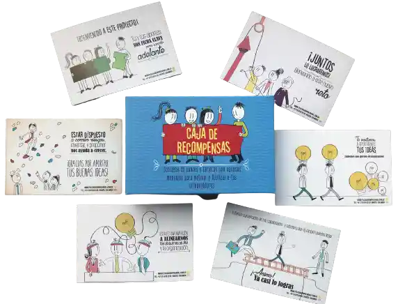 Caja de recompensas es el set de 30 postales con mensajes que te permitirán acompañar a tus colaboradores durante todo su ciclo de vida en la empresa. Con mensajes de bienvenida, felicitaciones, agradecimiento, fechas especiales y ánimo, podrás reconocer, retroalimentar y acompañar a tu equipo. Este BEST SELLER es la estrella de nuestro portafolio gracias a su versatilidad. Cada postal puede complementarse con un mensaje al respaldo. La caja incluye también 30 sobres para introducir cada postal.