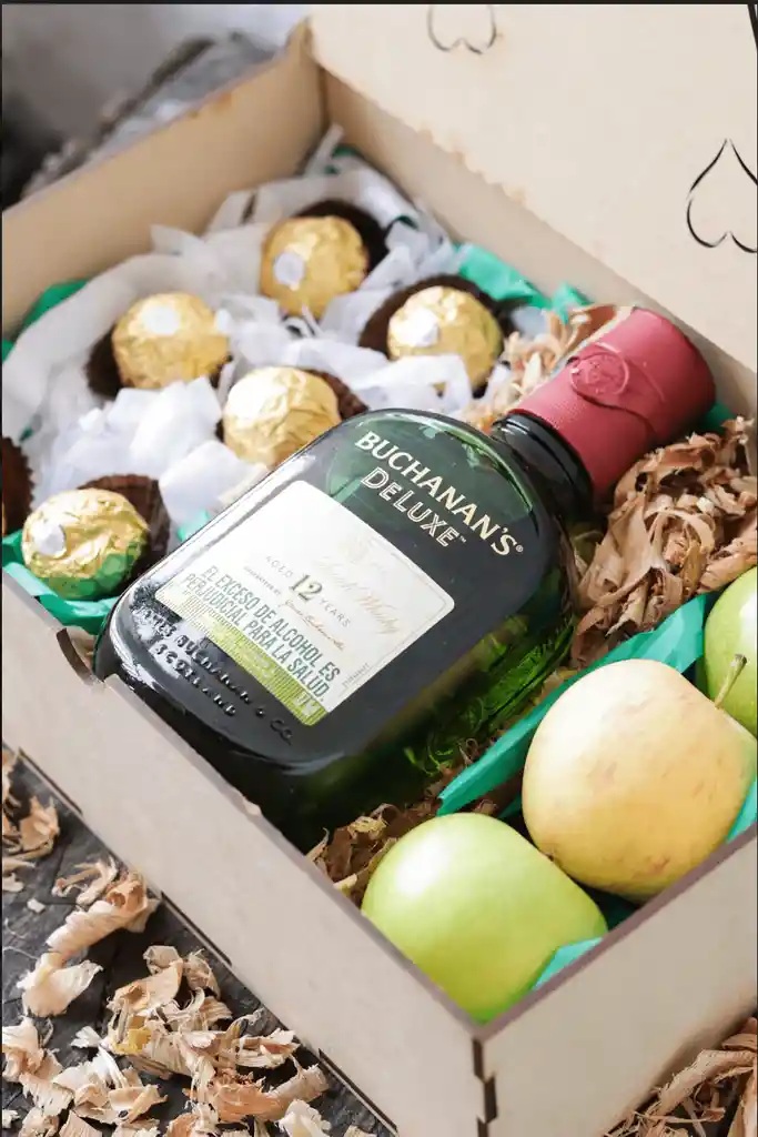 Caja de madera decorada que contiene: Botella Buchanan´s Deluxe x1 (una) unidad; Manzanas x3 (tres) unidades; Chocolates Ferrero Rocher x6 (seis) unidades y; Mensaje personalizado